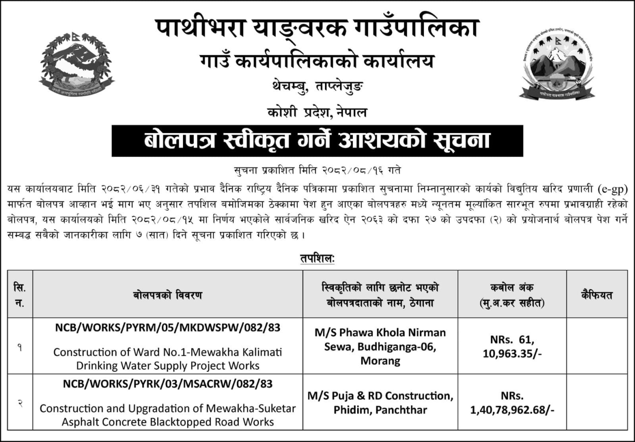 बोलपत्र स्वीकृत गर्ने आशयको सूचना।