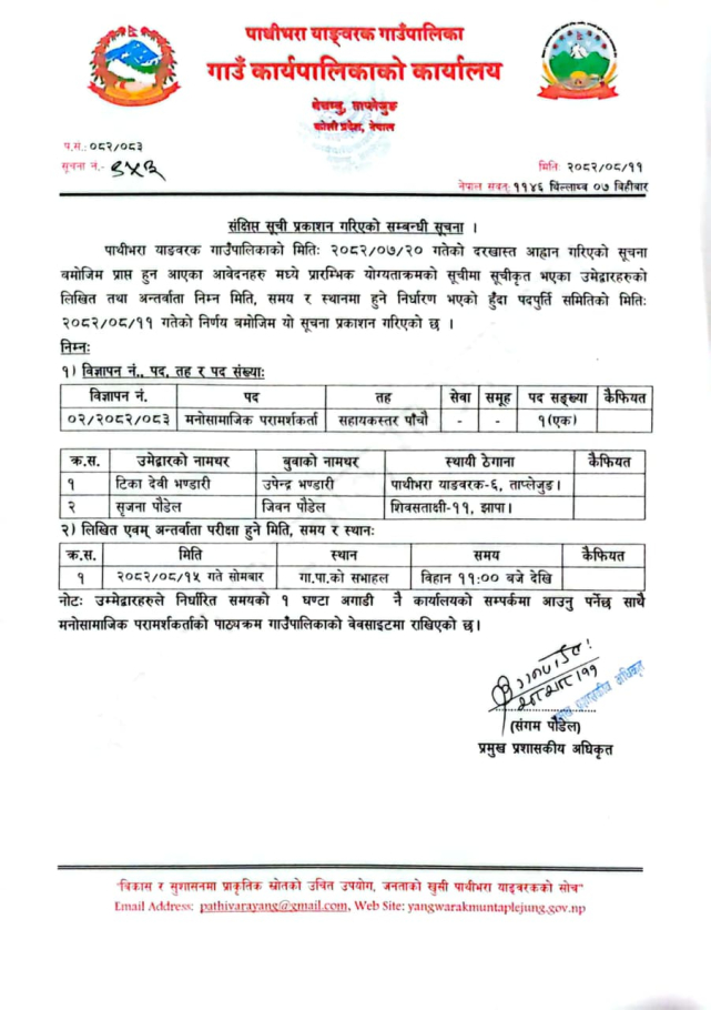 मनोसामाजिक परामर्शदाताको विज्ञापनका लागि संक्षिप्त सूची प्रकाशित गरिएको सूचना ।