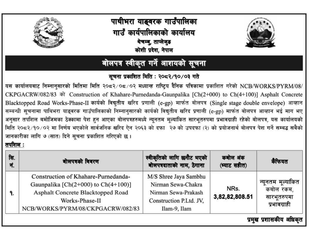 बोलपत्र स्वीकृत गर्ने आसयको सूचना ।